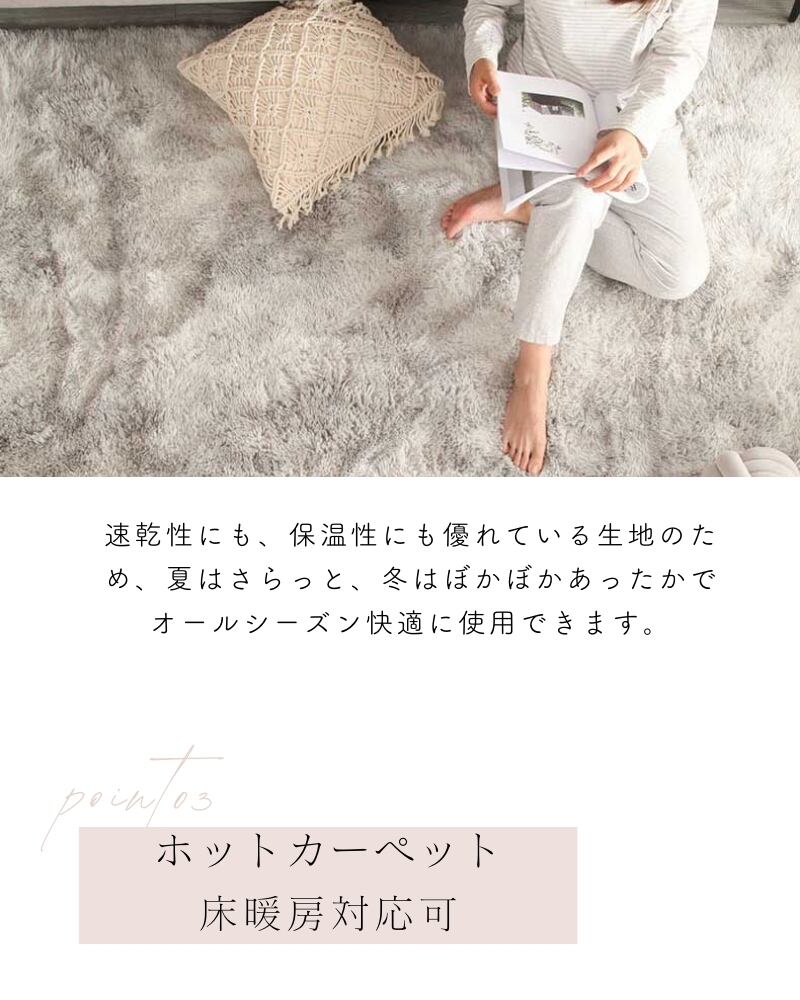 ・厚さ 15mm のウレタンに 40mm の長い毛足があり、足元がふわふわです。音を吸収し、足音など床から伝わる音を軽減します。そのままでも気持ちよくご使用いただけますが、寒い冬にはホットカーペットや床暖房にもご使用いただけます。